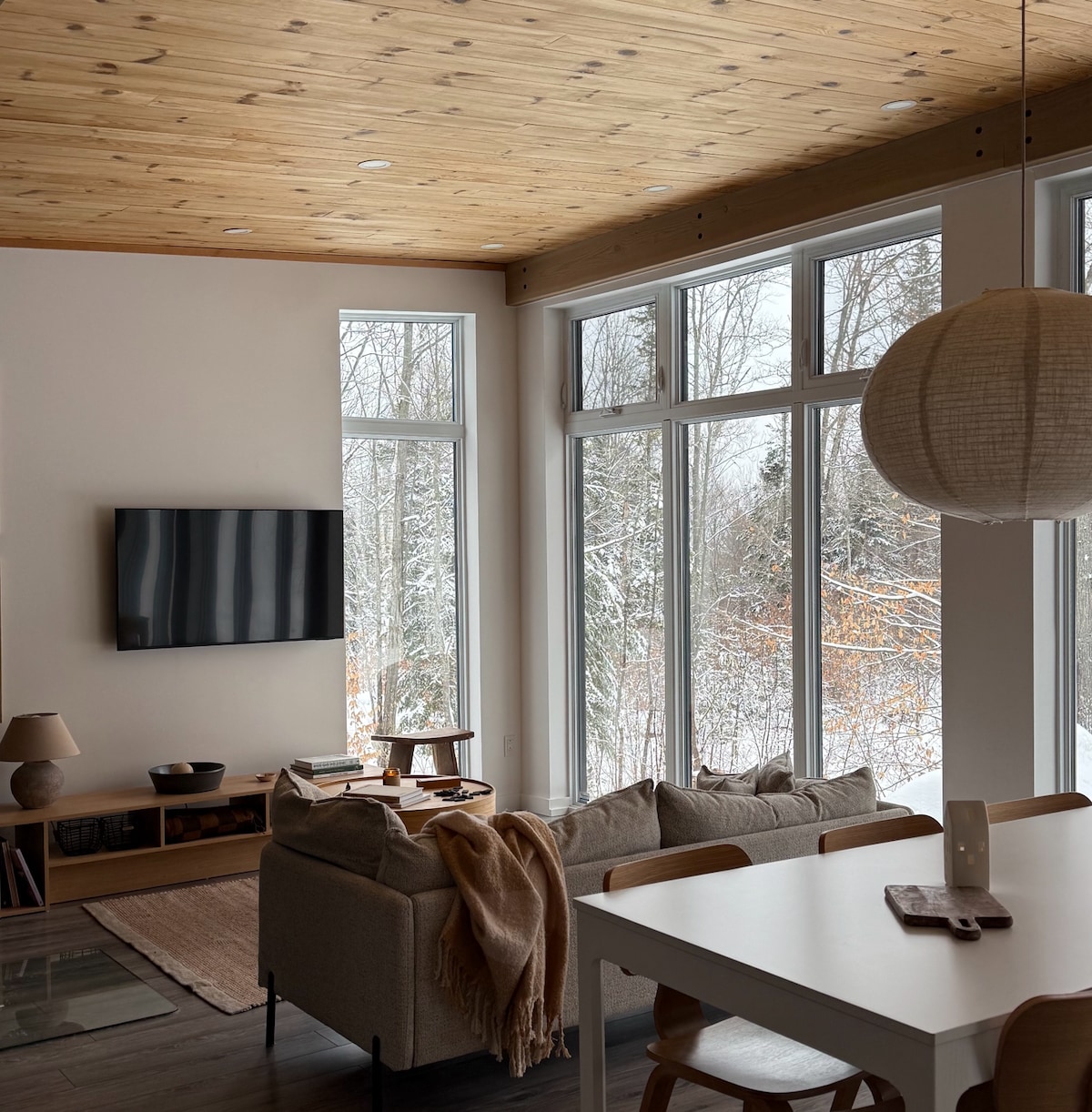 Chalet design au bord d’une rivière paisible, tubes de neige pour glisser,magnifique vue sur la montagne. À15 min du Spa La Source, du ski montcalm, de la tournées des cantons 🎿🥾 et d’Arbraska Rawdon. Idéal pour deux familles avec étages séparés. MAX 6 adultes, Parfait pour jeunes enfants (bien équipé). Très grand terrain intime, foyer intérieur/extérieur, hamac intérieur suspendu, tubes de neige, cinéma 🏠. Endroit calme (un seul voisin) avec Wi-Fii. Soucis du détails
