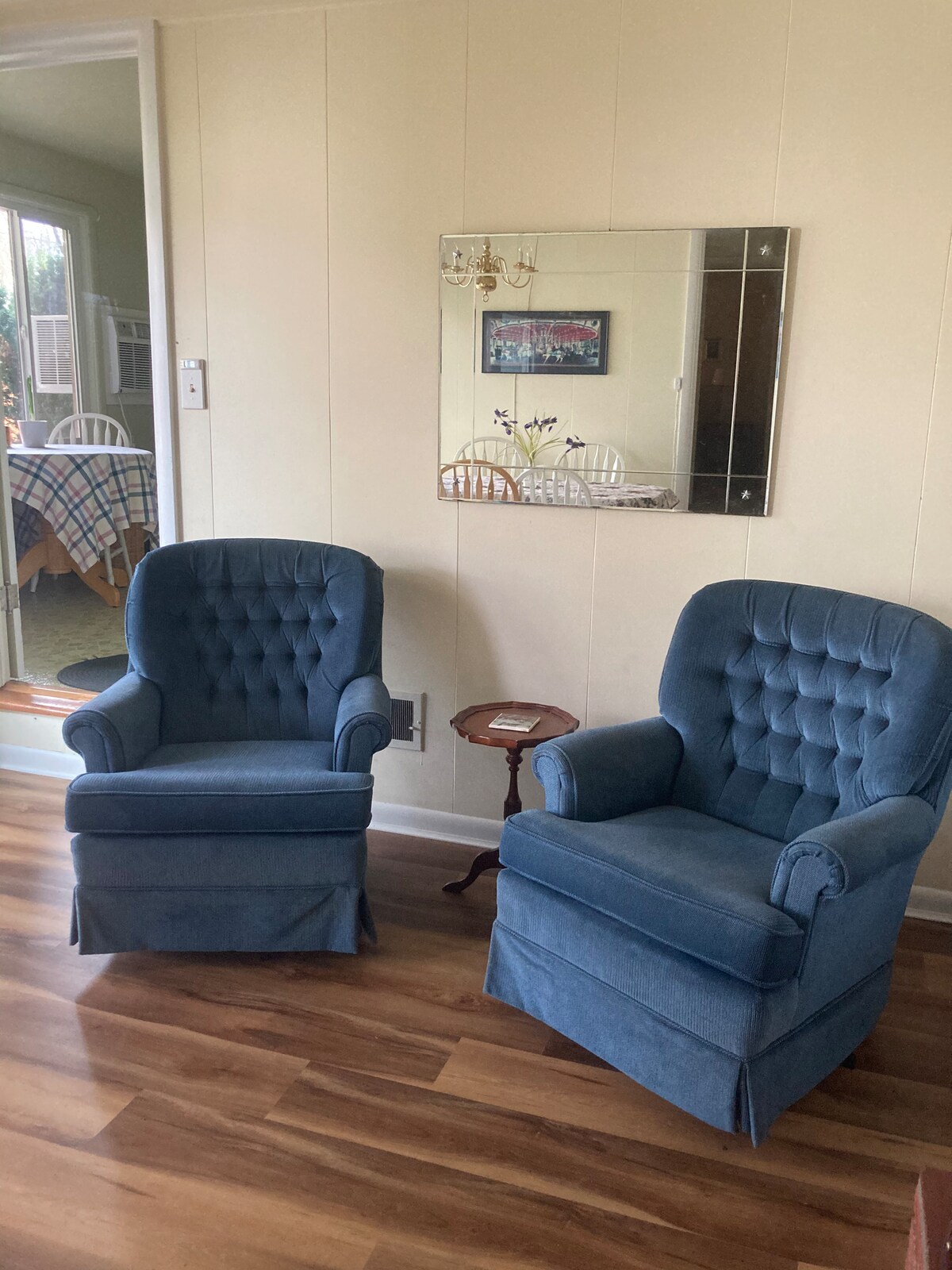 Tento světlý apartmá o rozloze 770 čtverečních stop se skládá z celého horního patra mého domu se dvěma prostornými ložnicemi s manželskými postelemi, velkým rodinným pokojem s rozkládací pohovkou a koupelnou s dvojitými umyvadly a vanou/sprchou. Není zde žádná kuchyně, ale je zde lednice, mikrovlnná trouba, kávovar, instantní hrnec a konvekční trouba / vzduchová fritéza. Poskytuji snídani (jogurt, ovoce, müsli, cereálie, káva, čaj, smetana). Hosté vstupují společnými předními dveřmi domu a míří nahoru do apartmá.