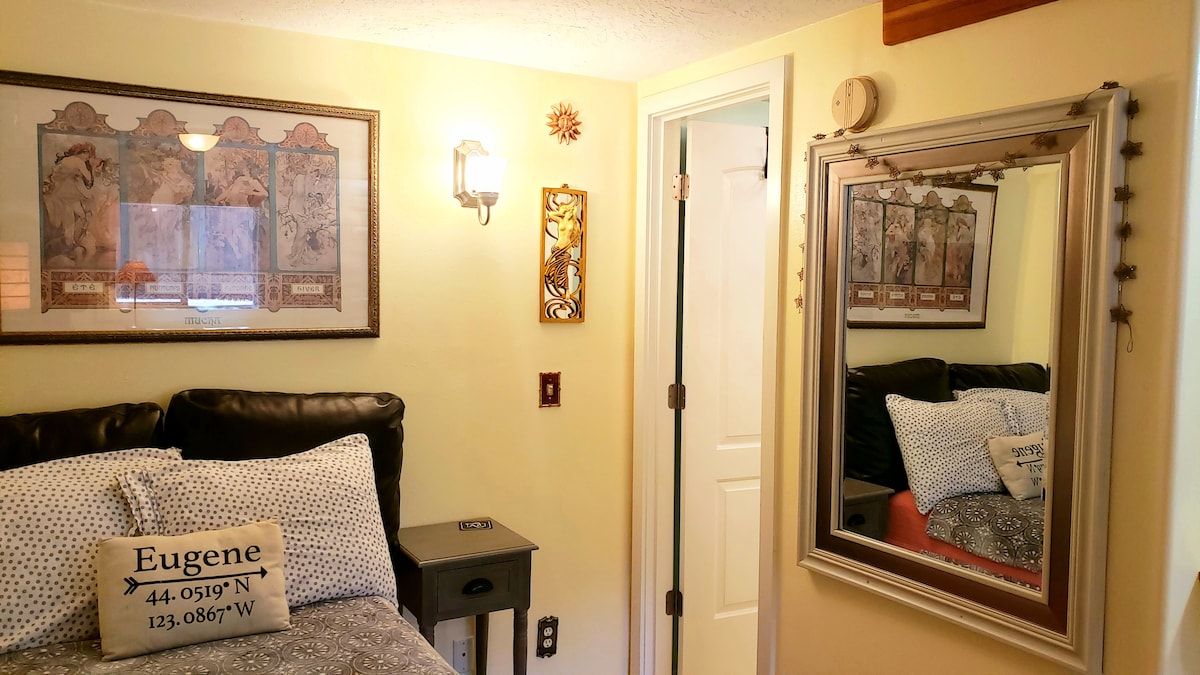 Our guest adu is a cozy, private studio (12' x 20'), with lot of natural light, 2 skylights, garden view, and attached patio/deck. Zahrnuje bezplatné používání nabíječky elektromobilů úrovně 2. Tichý, vyhřívaný, klimatizace, spousta vybavení, včetně wifi, kabelové TV, kávy, mini ledničky a mikrovlnné trouby. V blízkosti Lane Event Center a pár minut od centra a kampusu Oregonské univerzity. V docházkové vzdálenosti od restaurací a obchodů s potravinami. Dobré místo pro páry, obchodní cestující a sólo dobrodruhy.