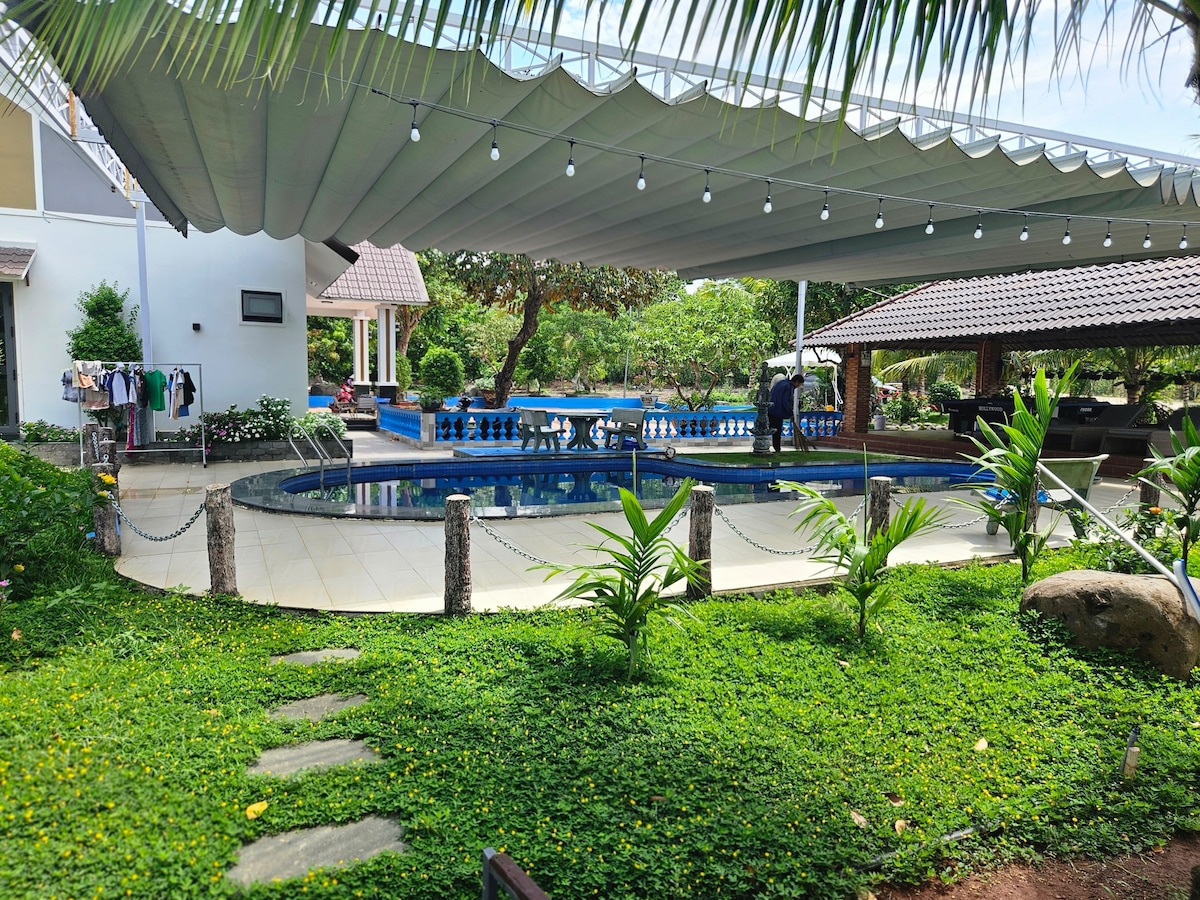 Special 20% discount for the first 10 customers. Welcome to our farm, where you can live close to nature. Full amenities for families with children, including: - 4 bedrooms (up to 16 people); - Swimming pool, football field, badminton court, pool table, outdoor grill, leafy hut for gatherings, karaoke, and fresh vegetables from our garden. Just 15km to Binh Chau Hot Springs, 30km to Ho Tram Beach. Hope you have a memorable experience reconnecting with nature with your family and friends.