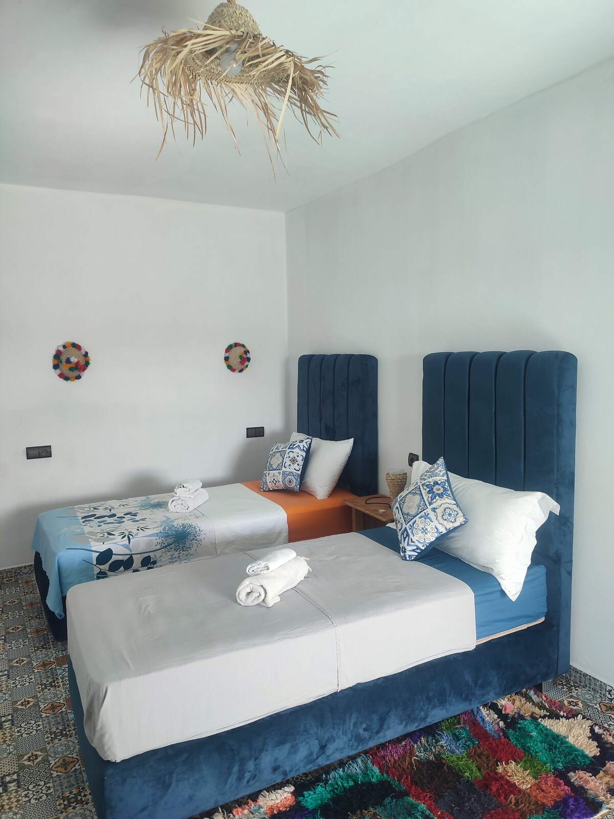 Vítejte ve svém stylovém apartmánu se 2 ložnicemi v Dolce Villa Sahel. Tento světlý a prostorný byt zahrnuje: 3 pohodlné ložnice Plně vybavená kuchyně a útulný obývací pokoj Soukromá terasa na ranní čaj Využij výhody sdílené vily: Bazén • Herní prostor • Střešní terasa • Marocký stanový salónek Ideální pro malé rodiny, páry nebo přátele, kteří chtějí objevovat Maroko v pohodlí a stylu. Nachází se v Khemis Sahel (Larache), v blízkosti pláže a místních skvostů.