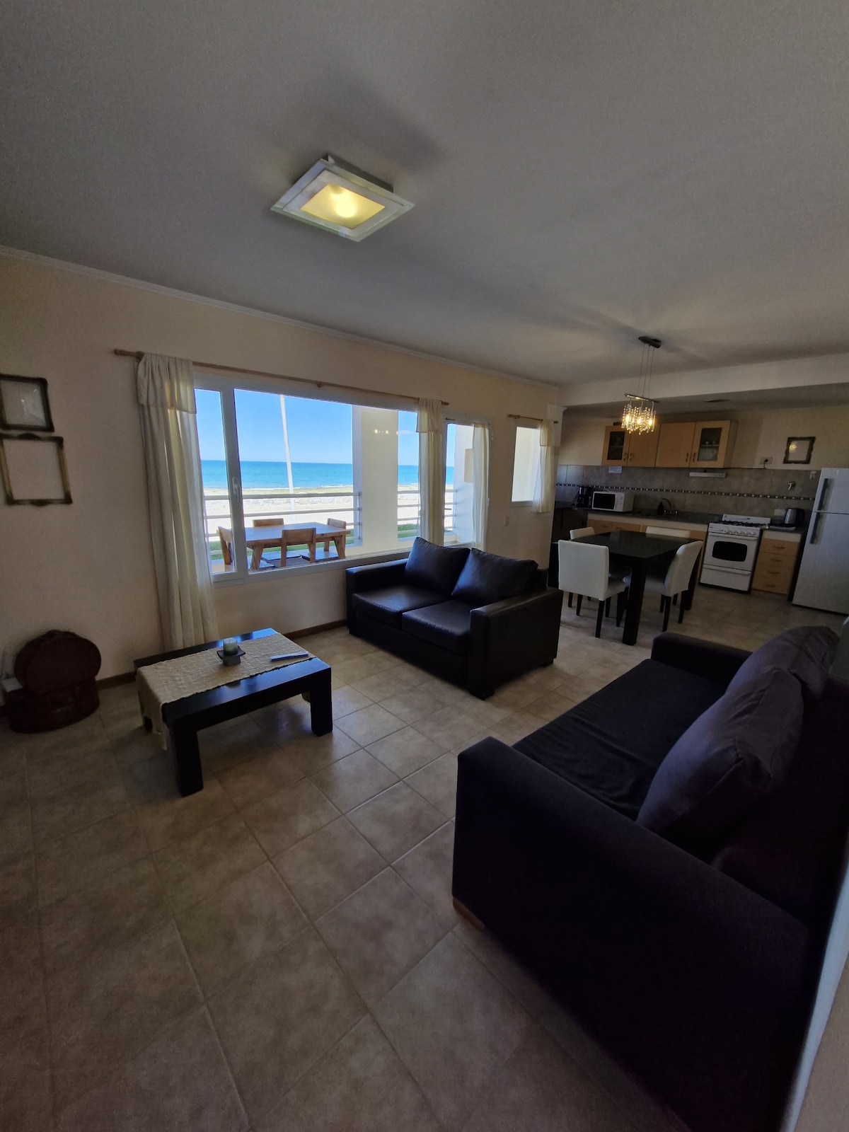 Departamento luminoso con gran vista al mar, sobre la Av. Costanera. Excelente ubicación. Especial para descansar contemplando el mar desde todos los ambientes. Totalmente equipado. Muebles de estilo. Cocina comedor con balcón. Living cómodo y habitación amplia. Baño con bañera. Piscina y quincho con parrillas. Cochera cerrada. A metros de la bajada a la playa. Las Grutas es un balneario familiar enclavado en el Golfo de San Matías, con playas de cálidas corrientes marinas que la hacen única.