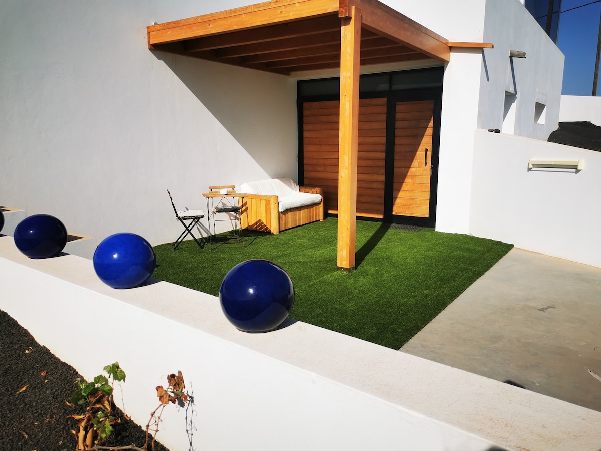 Ubytuj se v jednom ze dvou okouzlujících moderních hippie apartmánů o ploše 80 m² s jedinečným výhledem na národní park Timanfaya a jeho sopky. Apartmán má plně vybavenou kuchyň, obývací pokoj s panoramatickými posuvnými dveřmi a rozkládací pohovkou, HDTV, optický internet a ložnici s vlastní koupelnou v kanárském stylu. Odpočiň si na soukromé terase, namoč si nohy do bazénu se slanou vodou Césara Manriqueho, užij si nekonečné výhledy a obdivuj kouzelné západy slunce. 🩵