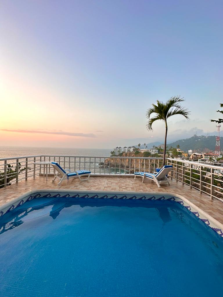 Pent House PET Friendly único en Acapulco con una vista a 360 grados. Alberca panorámica que permite gozar del show de los clavadistas de la Quebrada. Area de sala y comedor totalmente abierta hacia el exterior con terraza amplia. Cocina equipada y tres recamaras cómodas cada una con su respectivo baño. La decoración del PH es de estilo mediterráneo. El espacio goza de la ventilación natural de la brisa marina lo cual da una sensación de bien estar.