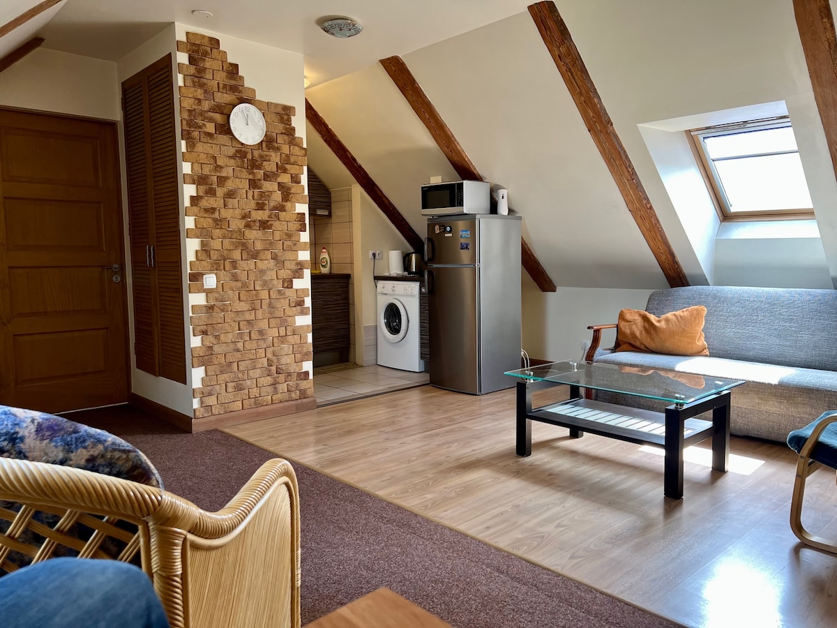 Prostorný penzion typu studio s balkonem a saunou se nachází v klidné soukromé čtvrti pro 2 dospělé (+ dítě/teenager). Otevřený obytný prostor typu studio nahoře; WC, sprcha a sauna dole. Má velká okna a balkon s výhledem na stromy a dvůr. Sporák, lednička krb wi-fi parkování zdarma pračka 1200 m do centra města a kaváren 700 m do pěších stezek podél řeky Komunikace v lotyštině a plynulá angličtina Na dvoře může být pes a kočka.