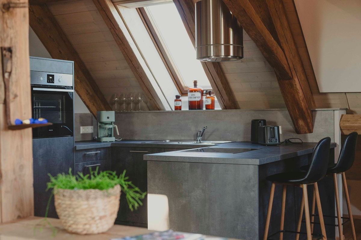 Exkluzivní ubytování mezi Bodamským jezerem a Allgäuskými Alpami Historická střešní konstrukce byla v roce 2023 přestavěna na mimořádný, okouzlující duplexní byt. V apartmánu o rozloze 80 m² bylo zachováno původní trámové stropní krovy. Z lodžie je výhled na malebnou kulturní krajinu Allgäu až po hory. Byt se nachází vedle kostela v klidné vesnici. Výchozí bod pro četné výlety, cykloturistiku, pěší turistiku nebo dny strávené koupáním. Center Parcs 6 km daleko.