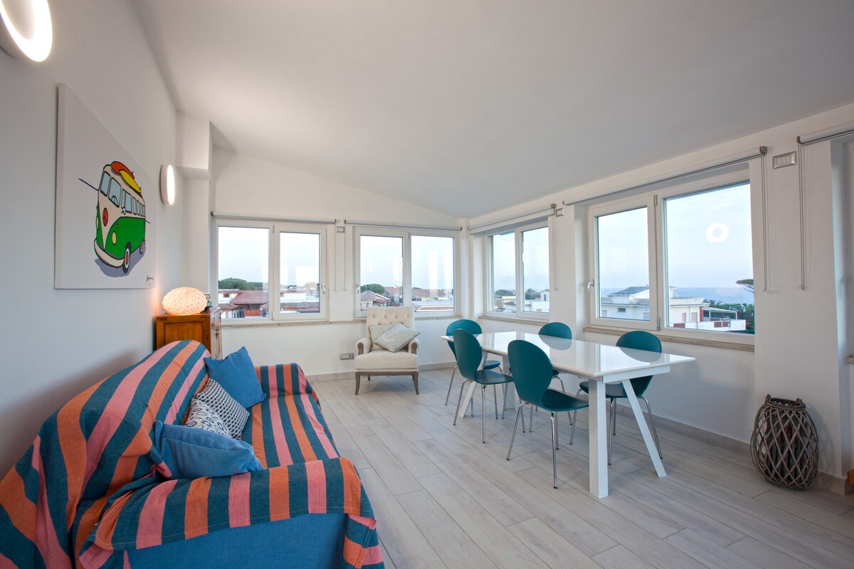 Discover RoofTop Anzio, an apartment in the top floor and only 100 meters from the beach, with a 360° panoramic view of the sea. Až pro 6 osob, s ložnicí s manželskou postelí, pokojem s patrovou postelí a obývacím pokojem s rozkládací pohovkou. Terasa o rozloze 150 m ² je vybavena jídelním stolem, pohovkami, lehátky a venkovní sprchou s teplou vodou. Ideální pro rodiny a páry: užij si nezapomenutelné chvíle s výhledem na úchvatné západy slunce 50 minut vlakem z Říma!