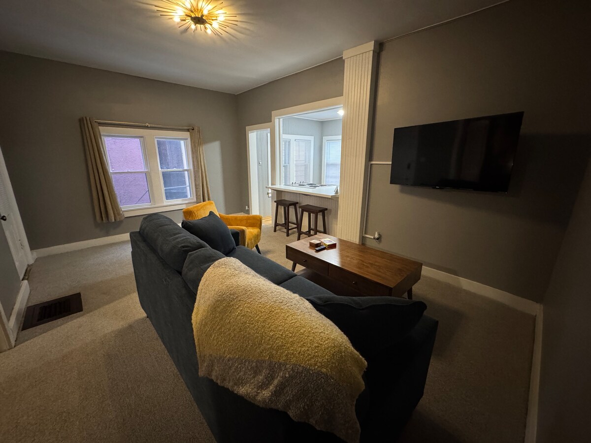 Od ledna 2024. Pronájmová licence # STR-23-00057. Kompletní přestavba. Všechno je nové. Navštivte Lawrence, KS za rozumnou cenu. Duplex. 750 čtverečních stop nového všeho. Sledujte filmy na Netflixu. Vychutnejte si občerstvení, kávu, vodu, nápoje. Chci, abyste se cítili pohodlně a šťastně. - Kompletně zrekonstruovaný duplex – Vstup a výstup pomocí kódového zámku - Smart TV s Netflixem a wifi – Parkování na příjezdové cestě – Čistota na prvním místě