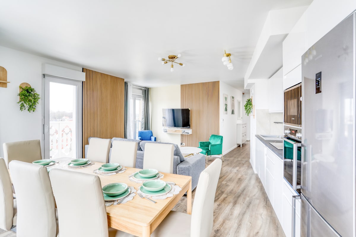 Welcome to our beautiful and large duplex F4 apartment of 87 m2 with a superb view from the 5th floor (with elevator). The flat is fully furnished, equipped and secure. Our apartment is close to many activity area by public transport: Paris center, CDG airport, VillePinte Exhibition Center, Salon du Bourget, Stade de France. Close to Disneyland and Parc Astérix by car. Can accommodate up to 8 guets