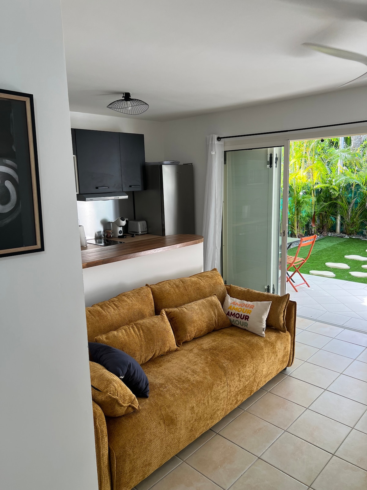 Studio s terasou, vybavenou kuchyní, výhledem na moře, parkovacím místem, které se nachází v rezidenci s nekonečným bazénem s výhledem na Îlet du Gosier. Rezidence je zabezpečená a nachází se ve vesnici Le Gosier; 10 minut chůze od pláže datcha, restaurací a obchodů. Ideální místo pro pár na dovolené. Studio má troubu, mikrovlnnou troubu, kávovar, pračku, lednici, TV, WI-FI.