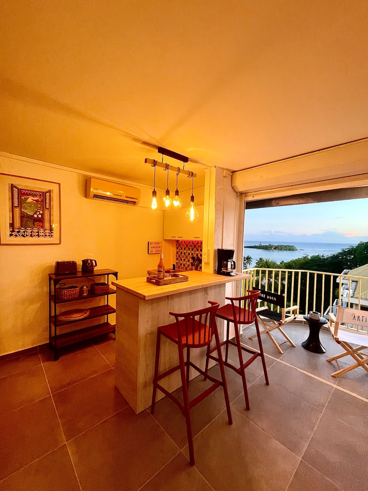 Vous serez tout de suite charmés par cette vue imprenable sur l'ilet Gosier. L'appartement est refait à neuf, avec 1 chambre climatisée vue mer, un grand salon et cuisine aménagée pour votre plus grand confort. La terrasse ouverte vous permettra de profiter de vos repas vue mer ! La résidence est très calme et idéalement placée, vous pourrez vous relaxer au bord de la piscine en toute tranquillité. Le logement et équipé d'une citerne, en cas d'éventuelle coupure d'eau.