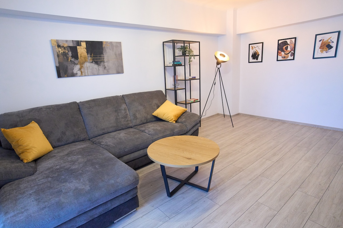 Moderní a pohodlný apartmán se nachází v centrální části Craiovy v klidné ulici,vybavený novými, které se skládají z: prostorné ložnice vybavené manželskou postelí, TV,psacím stolem,komodou; obývacího pokoje s velkou TV, rozkládacího koutu; krásně uspořádaného balkonu, nové koupelny vybavené vanou ; plně vybavené kuchyně: sporák,lednička, pračka, kávovar, digestoř, talíře, šálky, příbory, kuchyňské náčiní atd.; chodba s věšákem a šatnou. Veškerý nábytek a vybavení jsou nové.