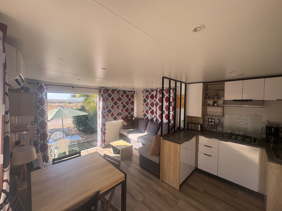 Mobilní dům s krytou terasou, který se nachází v kempu Les Salins de la Gardiole. Velikost 22 m² je ideální pro 4/5 osob. Byl kompletně zrekonstruován. Skládá se z jedné ložnice s manželskou postelí, jedné ložnice se 2 samostatnými lůžky. V obývacím pokoji lze pohovku rozložit na manželskou postel. Kuchyň je vybavena myčkou, plynovou varnou deskou, mikrovlnnou troubou, kávovarem, pračkou... Koupelna je vybavena hydromasážní sprchou. Samostatná toaleta.