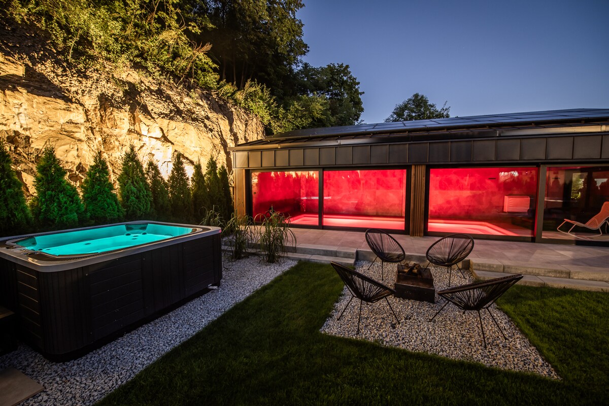 Malý kousek ráje na Visle! Každá chata má vlastní terasu s dřevěným stolem, pergolou a lehátky a vestavěnou vířivkou na terase – připravenou na vyžádání po předchozí domluvě. Vedle terasy je zahrada s trávníkem, krbem a grilem. Je to ideální místo pro romantický pobyt, rodinnou relaxaci nebo pobyt ve větší skupině.