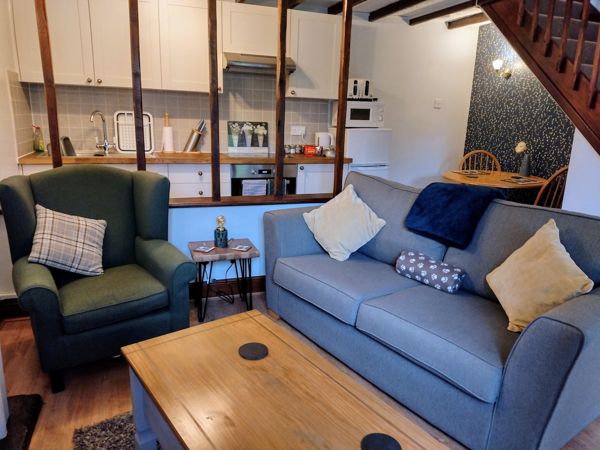 Odlehlá, 2-podlažní, samostatná chalupa s velkým, otevřeným trojitým obývacím pokojem v 1. patře s úžasným výhledem. Dole je ložnice s manželskou postelí, sprchový kout a kuchyň/jídelna s krbem na dřevo, jídelním stolem a dvěma pohodlnými židlemi s výhledem na rozlehlou krajinu. Francouzské dveře se otevírají na terasu se zahradním nábytkem a krbem a soukromou zahradou s grilem. Vynikající signál Wi-Fi po celém domě. Dobře vychovaní psi vítáni - max. 2