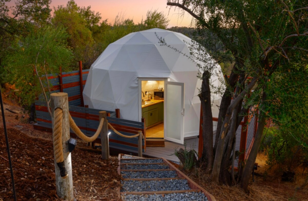 Naše glampingová geo-kupole – Tato kupole daleko od domova v krásných zvlněných kopcích Newcastlu v Kalifornii rozhodně není obyčejná. A své vzpomínky odtud si budete navždy vážit! Zažijte dokonalý glampingový pobyt v naší krásné kopuli inspirované stylem boho s luxusním ložním prádlem, plnohodnotnou soukromou koupelnou a kuchyní s řeznickým pultem.