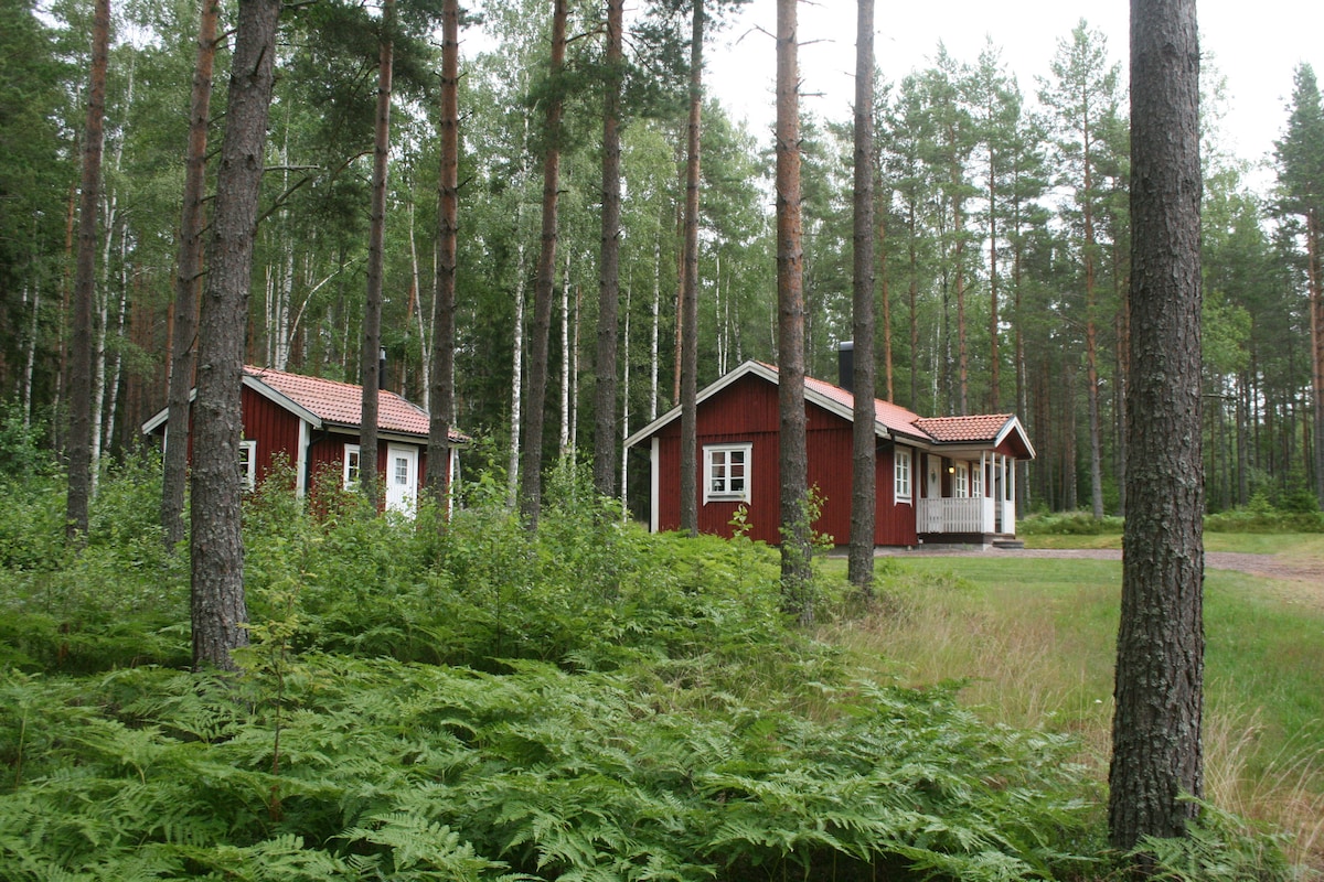 Samostatná chata v lese s volně stojící saunou na dřevo. (4+1 lůžka) V chatě se nachází kuchyně a WC, ložnice s manželskou postelí (140 cm) a patrová postel (2 ks 90 cm). Obývací pokoj s jídelním stolem, velkou pohovkou a krbem na dřevo Pět minut od dvou různých jezer, z nichž nich jedno má veřejné koupaliště, v druhém jezeře je přístup k plastovému pontonu, pokud je to žádoucí, lze si obstarat rybářský lístek. Chata je vybavena většinou kuchyňských potřeb a zahradním grilem. Ložní prádlo a ručníky jsou k dispozici za 100 SEK/osoba.