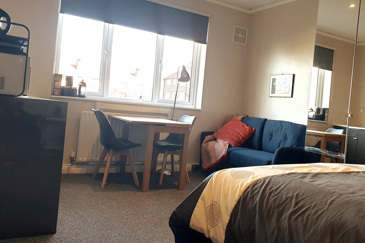 Studio apt on New Kings Road . Newly refurbished . Parsons Green Ideal for single professional. For bookings over 2 weeks cleaner is provided free of charge . Very bright apartment on the first floor. Neutral colours , wooden floor , modern kitchen area with induction hob , telescopic cooker hood, oven with grill , microwave , washing machine with dryer. Quartz worktop. Vi -Spring double-bed. Vispring is a luxury British mattress manufacturer . Italian glass wardrobe . Fast fibre internet !