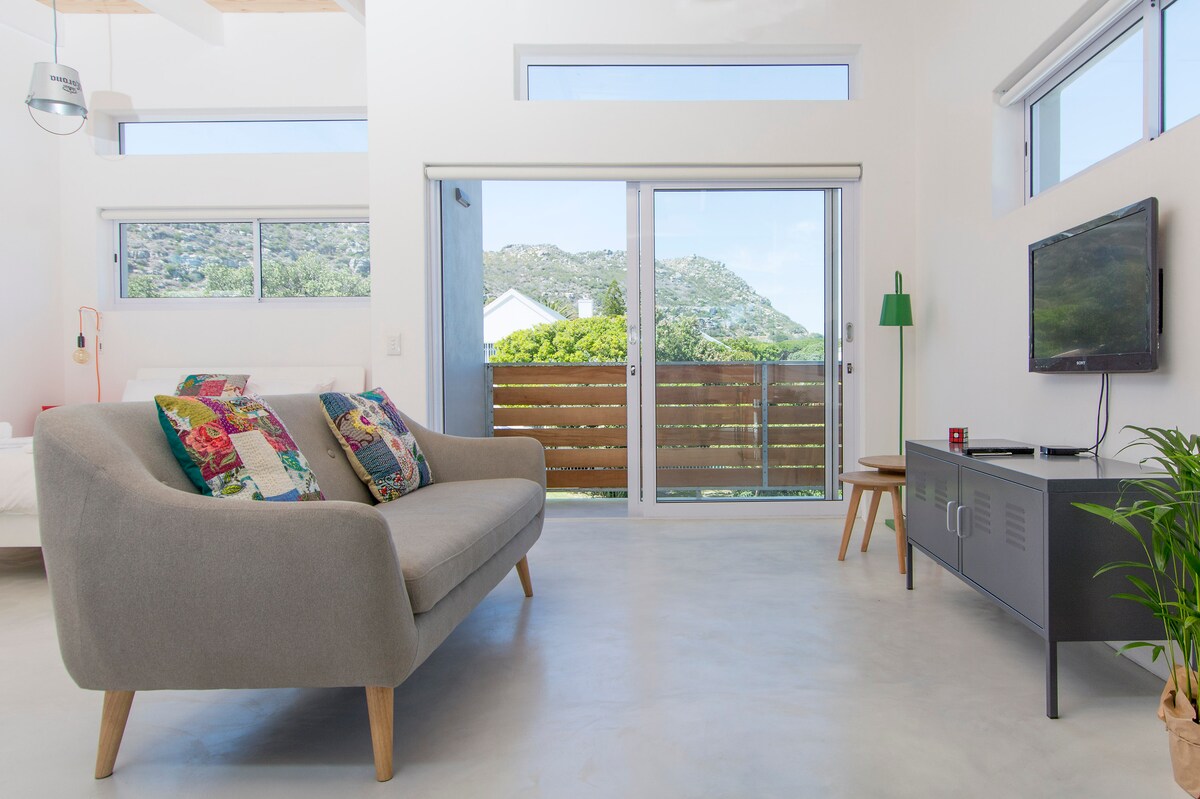 Bývalé umělecké studio bylo přeměněno na krásný malý dům, který je připojen k hlavnímu domu s panoramatickým výhledem do údolí z postele a zahrady. Dále na vrcholu hory Kronenzicht v klidné cul-de-saq se můžete vyhnout při koupání ve své soukromé a vyhřívané vířivce, relaxovat pod dešťovou sprchou s nádherným výhledem na zadní stranu Stolové hory a malou lví hlavu nebo začít svou procházku při západu slunce na krásných písečných dunách vedle našeho pozemku, dokonce až dolů do Sandy Bay.