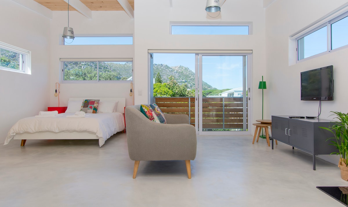 "Studio On Benning Drive Kommetjie" is a couple 's retreat located 100 meters from Long Beach. Užij si procházky po pláži, horské stezky, plavání, surfování a výběr místních restaurací a lahůdek. Soukromé studio s možností vlastního stravování se nachází v zadní zahradě našeho rodinného domu se zcela soukromým a samostatným vchodem, který nabízí moderní bydlení, soukromou terasu, vnitřní a venkovní sprchu. The open-plan studio has a queen-size bed, modern kitchenette with high-spec appliances and en-suite bathroom.