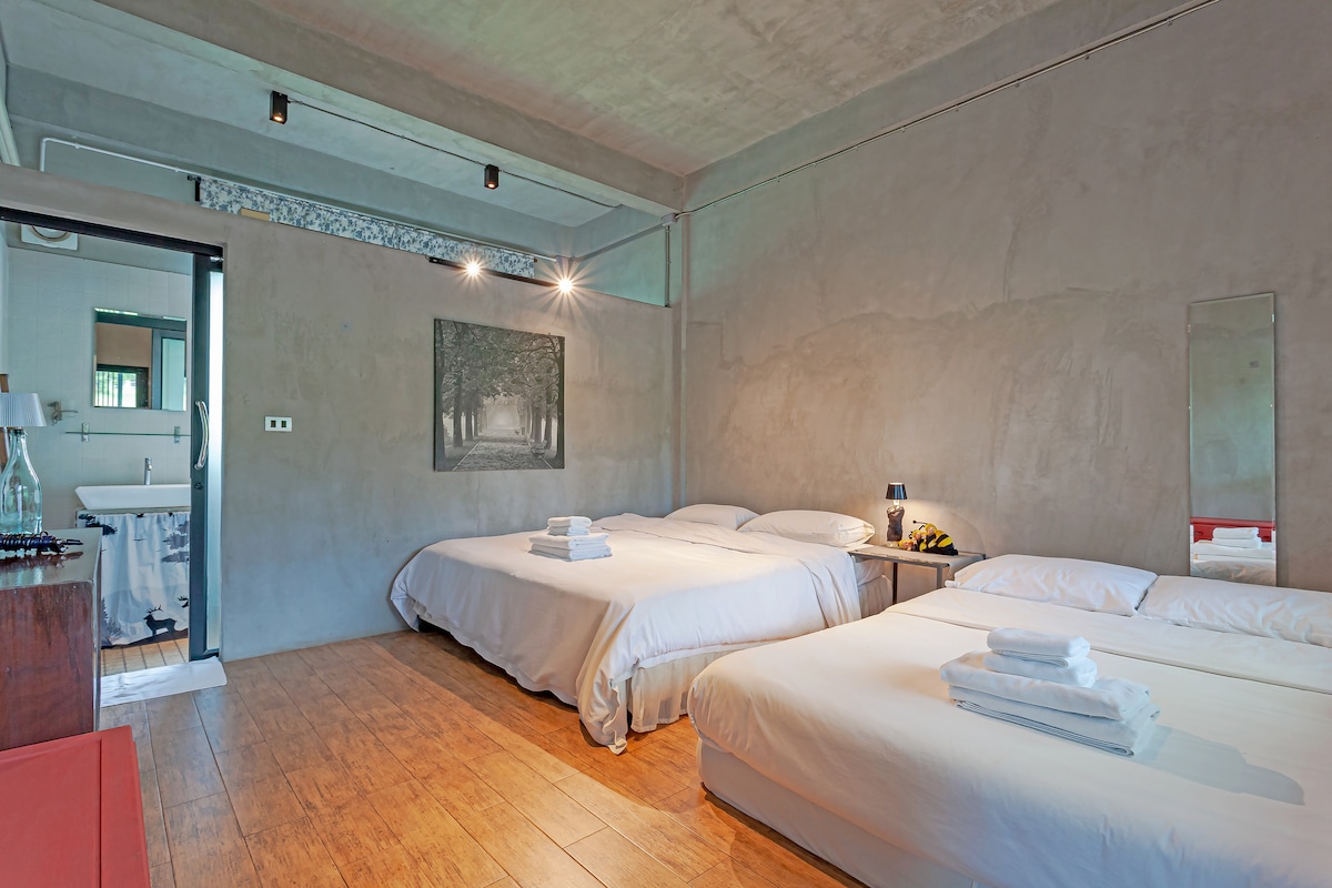 This Thai Villa is within Pupimarn Resort. It is very quiet and peaceful, great for being one with nature! Ideal for traveling with groups of friends or families. It is a bit far from the main road, but the plus side is that it is very quiet and you couldn't be more with nature than around here. The property is separated into 2 houses, 1 villa and 1 small house. The villa has 2 bedrooms 3 bathrooms with a huge living room, and the small house (10 feet away) has 1 bedroom 1 bathroom.