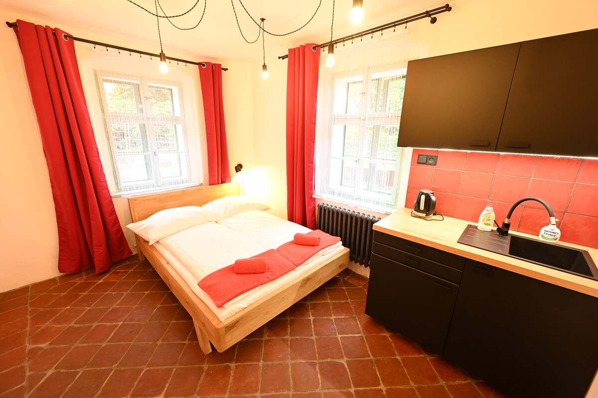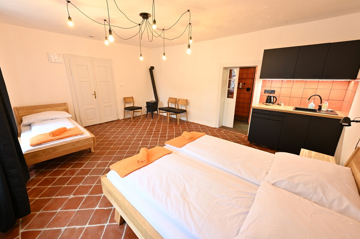 Nově zrekonstruovaná vila z 18. století. Z vily je krásný výhled do okolí. K dispozici celý dům o ploše 300m2, s dvěmi ložnicemi s vlastními koupelnami. V patře společenská místnost s pohovkami, stolem. V přízemí je plně vybavená kuchyň, jídelna, obývací prostor s krbem, dvě oddělené toalety. K domu náleží velká terasa se zahradním nábytkem a grilem. Sauna je k dispozici v malém technickém domečku na dvoře. Nealko, víno, pivo - za poplatek. Zdarma je pro vás připravená káva a čaj.