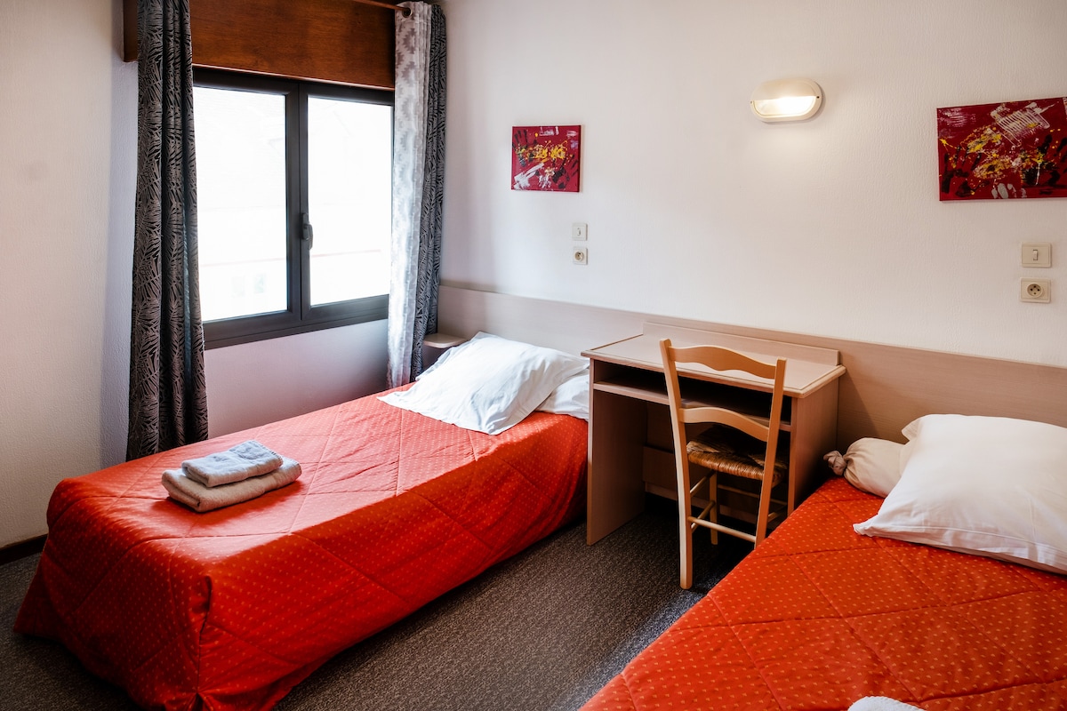 L'Appart'Hôtel Le Pèlerin vous donne la possibilté de louer une chambre comprenant 2 lits individuels, un téléviseur écran plat , la climatisation réversible et une salle de bain privative avec douche, wc et bidet et séche cheveux. L'accès au WIFI est gratuit.