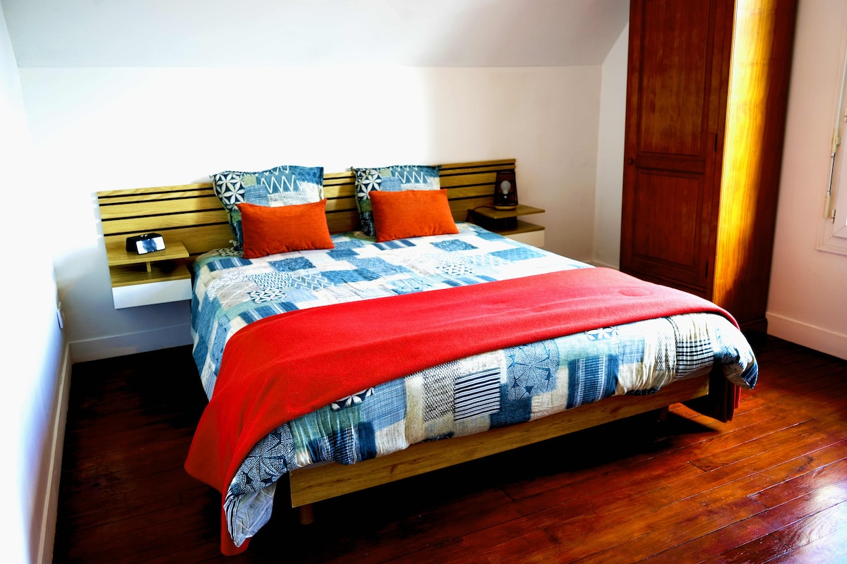 Chalupa o velikosti 30 m² na konci zalesněné a uzavřené zahrady našeho pozemku. 3 prostory: vybavená kuchyň, obývací pokoj, ložnice (postel 160 cm). TV pouze s kanály TNT, Wi-Fi pro tvůj počítač. Samostatná toaleta, sprchový kout. Přístup na terasu a do zahrady. Nachází se u brány cyklostezky Voie Verte, Vélo Francette, 5 km od centra Caenu (středověkého města) a 30 km od moře. Před domem je autobusové nádraží. Bezplatné parkování, místní na kole. Tvůj pejsek bude přijat na požádání.