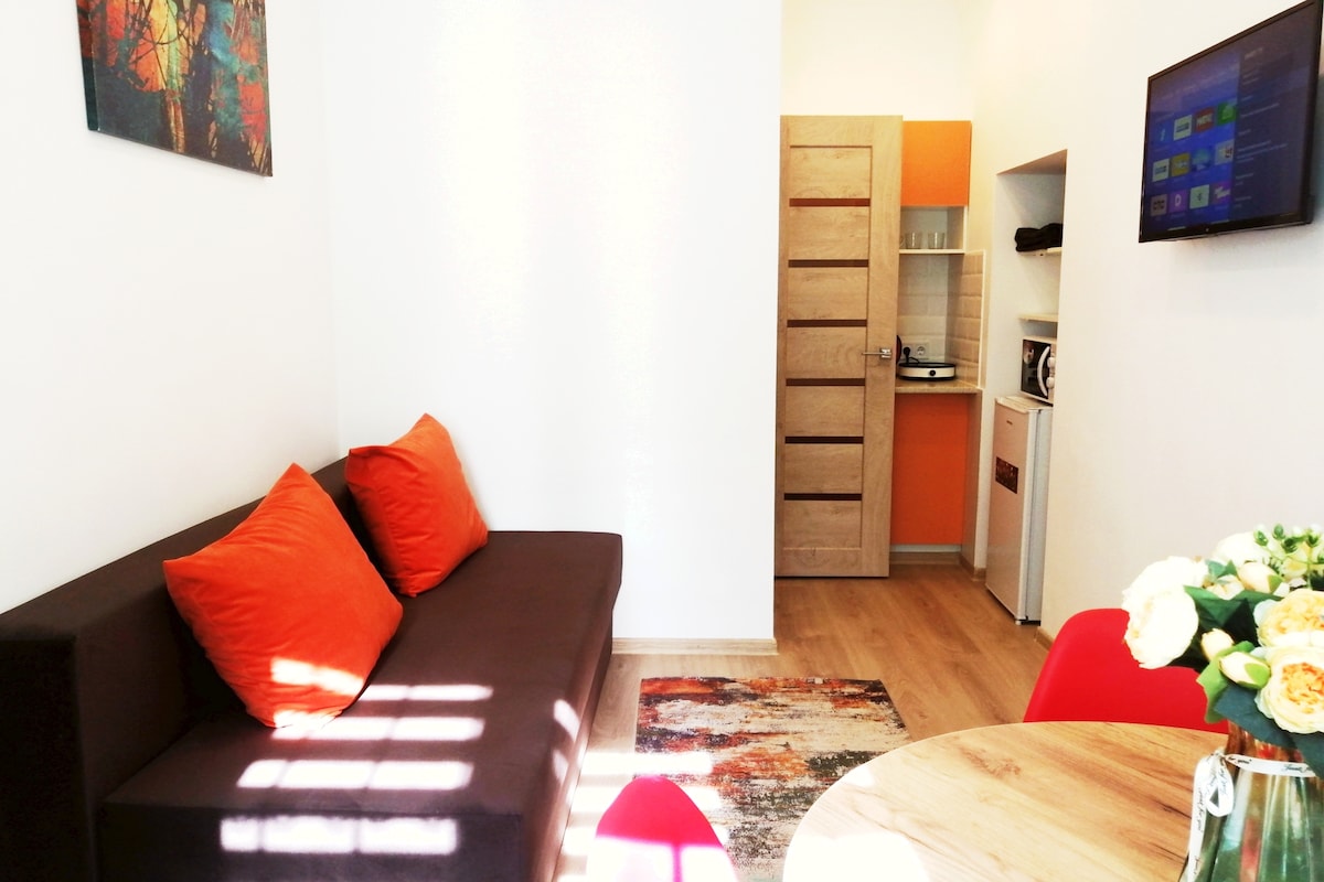 New apartment in the heart of the city located on a quiet street will allow you to relax despite the noise outside the door. The room has everything you need even for your long stay: fitted kitchen, refrigerator, induction hob and everything you need for cooking ,washing machine with dryer,internet and smart tv.Near restaurants,entertainment venues,cathedral,aquarium. Wellcome🩵💛