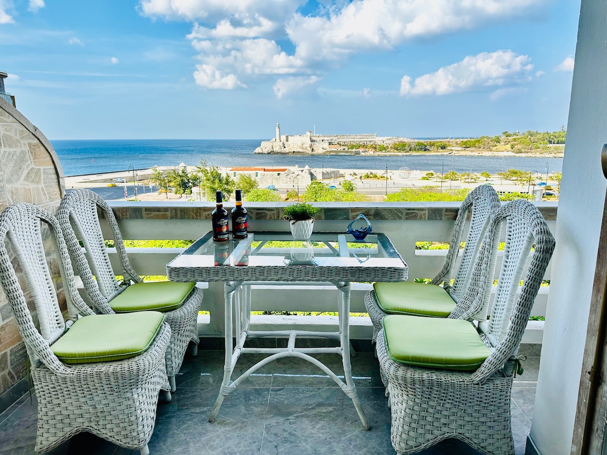 Our beautiful and elegant apartment is located in the heart of Old Havana, a UNESCO World Heritage site. We are on the 9th floor of a 1950s Havana building with spectacular bird's-eye views of the entrance to Havana Bay and its 17th-century fortifications There are two elevators in the building. Enjoy breathtaking sunrises and sunsets while sipping a coffee or a refreshing mojito. Walk to all the attractions of the Historic Center and some of the best bars and restaurants in the city