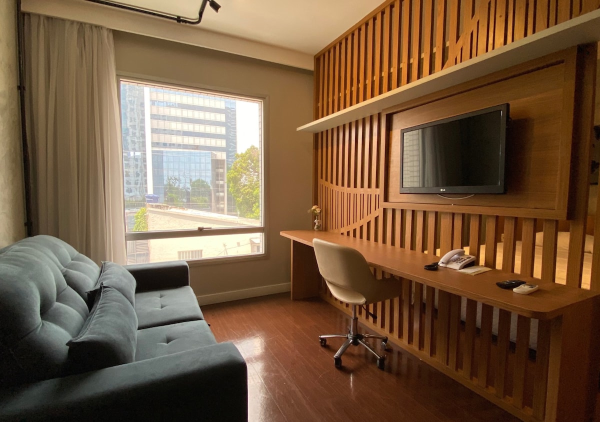 Studio de luxo com vista deslumbrante do rio.