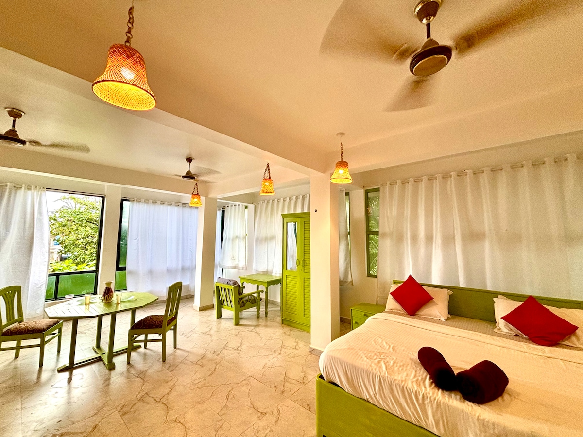 Spacious, Classy Retreat near Morjim Beach! Discover our warm and fully-furnished, ultra-spacious room located right in the vibrant heart of Morjim. The large bedroom offers plenty of room to spread out and chill, complemented by a dedicated private attached bathroom. The best part? The famous Morjim Beach is easily walkable from your door, offering you fantastic, direct views and effortless access to the sand and surf. Book your spacious, perfectly-located escape today!