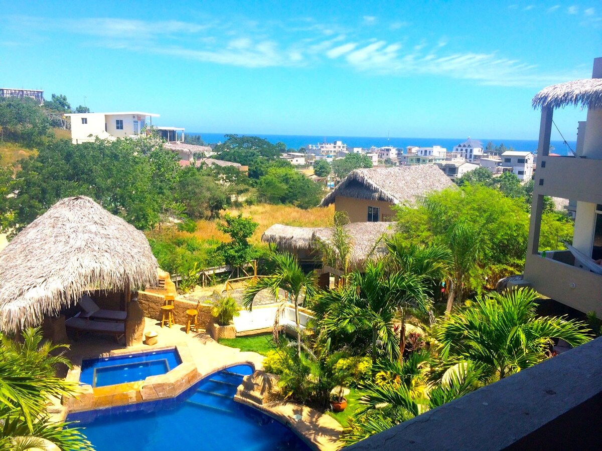 Užij si svůj útulný pokoj přímo na pláži. Ideální pracovní prostor s venkovním posezením na balkóně s výhledem na bazén a relaxační prostor těsně pod ním na zahradě. V pokoji je manželská postel a futon. Ceníme si zdejšího klidu a očekáváme, že hosté budou dělat totéž. Je to jen krátká procházka na rušnou párty v Montañitě. * Lekce surfování a pronájmy *Mikropivovar/restaurace *Káva/ čaj *Prádelna *Bazén avířivka *60palcový TV salonek *Obchod