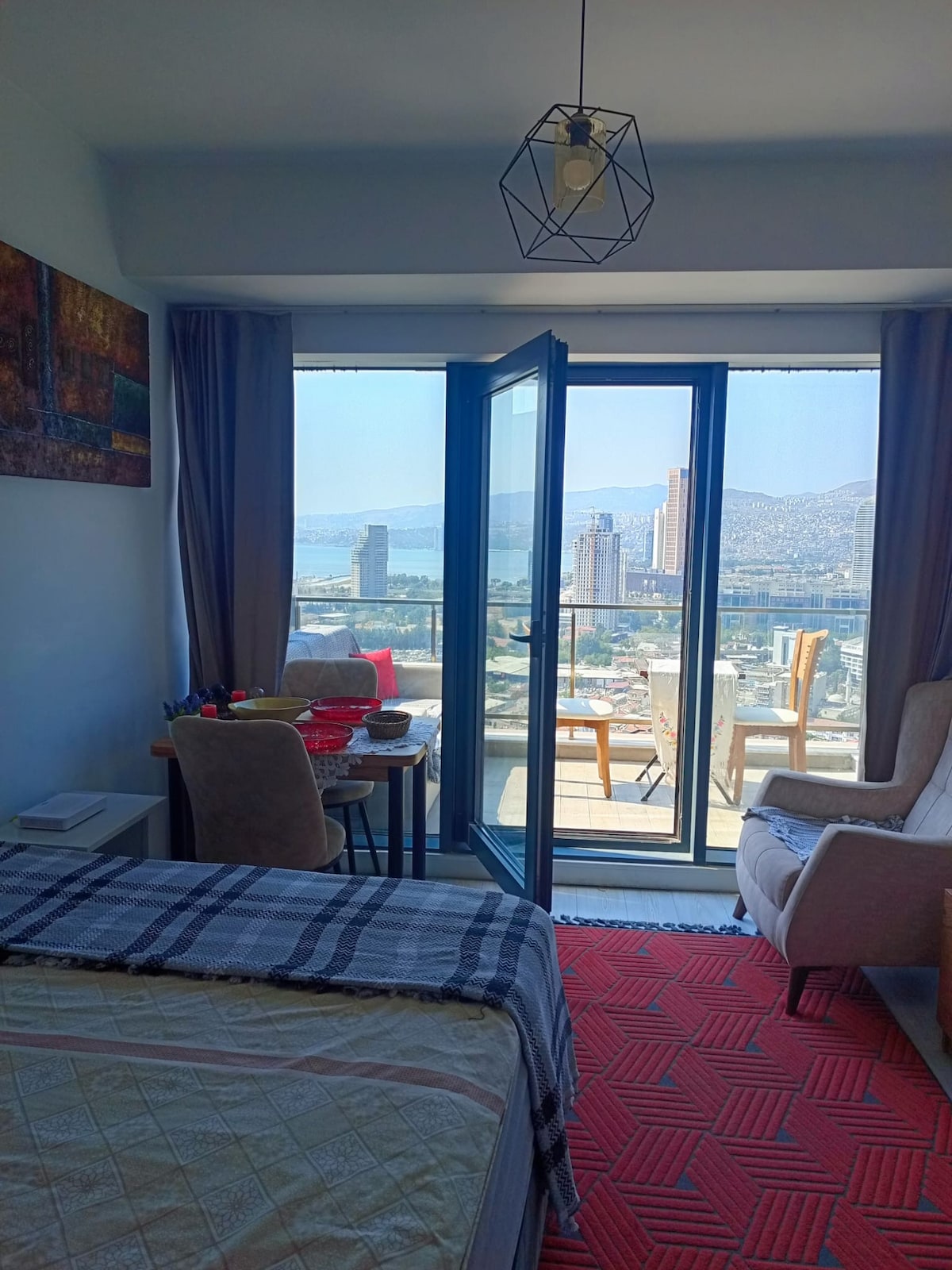 Gökdelenin en tepesinde Muhteşem Teras a sahip olan bu şık stüdyo daire, şehir ve muhteşem Körfez manzarası ve modern tasarımıyla konforlu bir konaklama sunar. TV, (Wi-Fi ) klima, konforlu yatak, ankastre mutfak ve geniş Teras mevcuttur. Havuz, spor salonu ve kapalı otopark kullanımına açıktır. Dilerseniz balkonda da yatak olabilen çek yat mevcuttur.şu an için havuz kullanıma kapalıdır