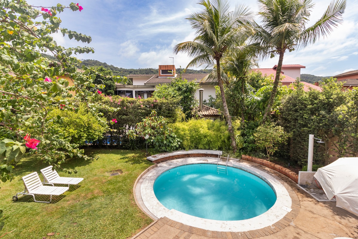 Sezónní dům 150 m od pláže Pernambuco (Guarujá). Nabízí 3 prostorné apartmány s klimatizací, obývací pokoj s dvojitou výškou stropu, mezipatro s krbem a rozkládací pohovkou. Plně vybavená kuchyně, toaleta a tropická venkovní koupelna u bazénu. Rekreační areál s bazénem, trávníkem, grilem a pecí na dřevo. Garáž pro 2 auta. Vedle Pão de Açúcar, Shopping Jequitimar, Companhia da PM 400 m od domu.