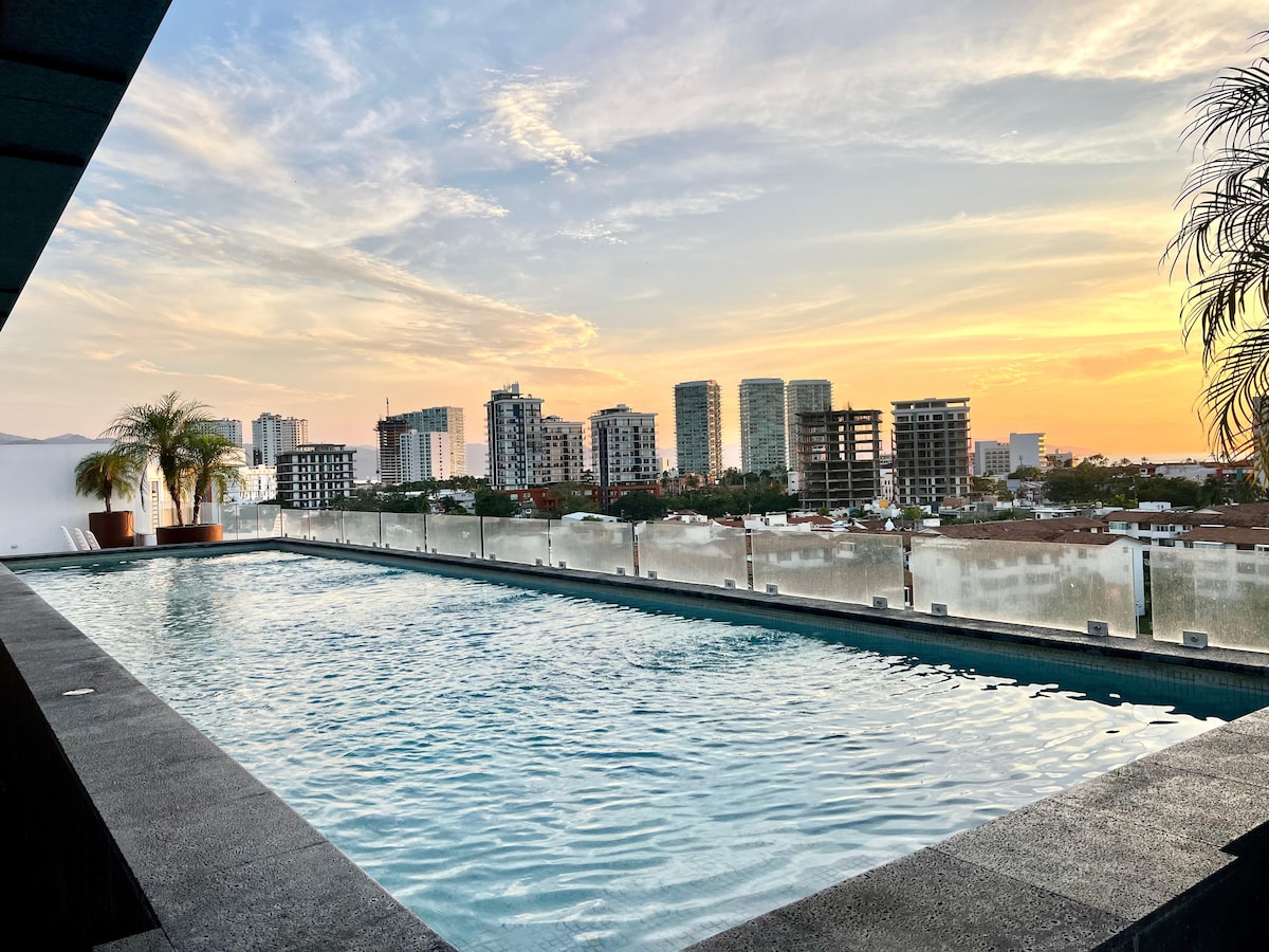 Vítej doma ve svém MODERNÍM bytě v 7. patře. Váš střešní nekonečný bazén s úchvatným výhledem na moře a výletní lodě: prostě úžasné! Náš prostor nabízí veškeré pohodlné vybavení. Gril na střeše nebo posilovna s výhledem? Máte to! Vše v perfektní lokalitě; pouze 12 minut chůze od pláže, restaurací, barů, obchodů, nákupních center, kina a nemocnice. Malecón, Romantica a Marina jsou rychle dostupné 10 minut jízdy! VÁŠ vysněný pobyt s úžasným výhledem ze střechy přímo zde v krásném PV.