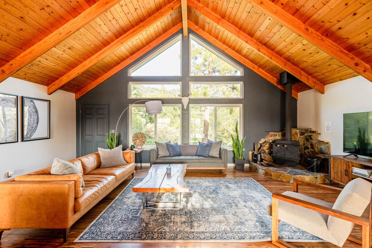 Vítej v srubu svých snů! - Luxusní chata poblíž Yosemitského národního parku – 3 ložnice, 2 koupelny, vhodné pro domácí mazlíčky – Otevřený obývací prostor s klenutými stropy a krbem z kamene – Venkovní vířivka s nádherným výhledem na hory – Plně vybavená kuchyně s jídelním koutem pro 8 osob – Elegantní interiéry kombinují rustikální styl a pohodlí – Relaxační venkovní prostor s ohništěm a grilem – V blízkosti turistických stezek, jezera Bass a Mariposy