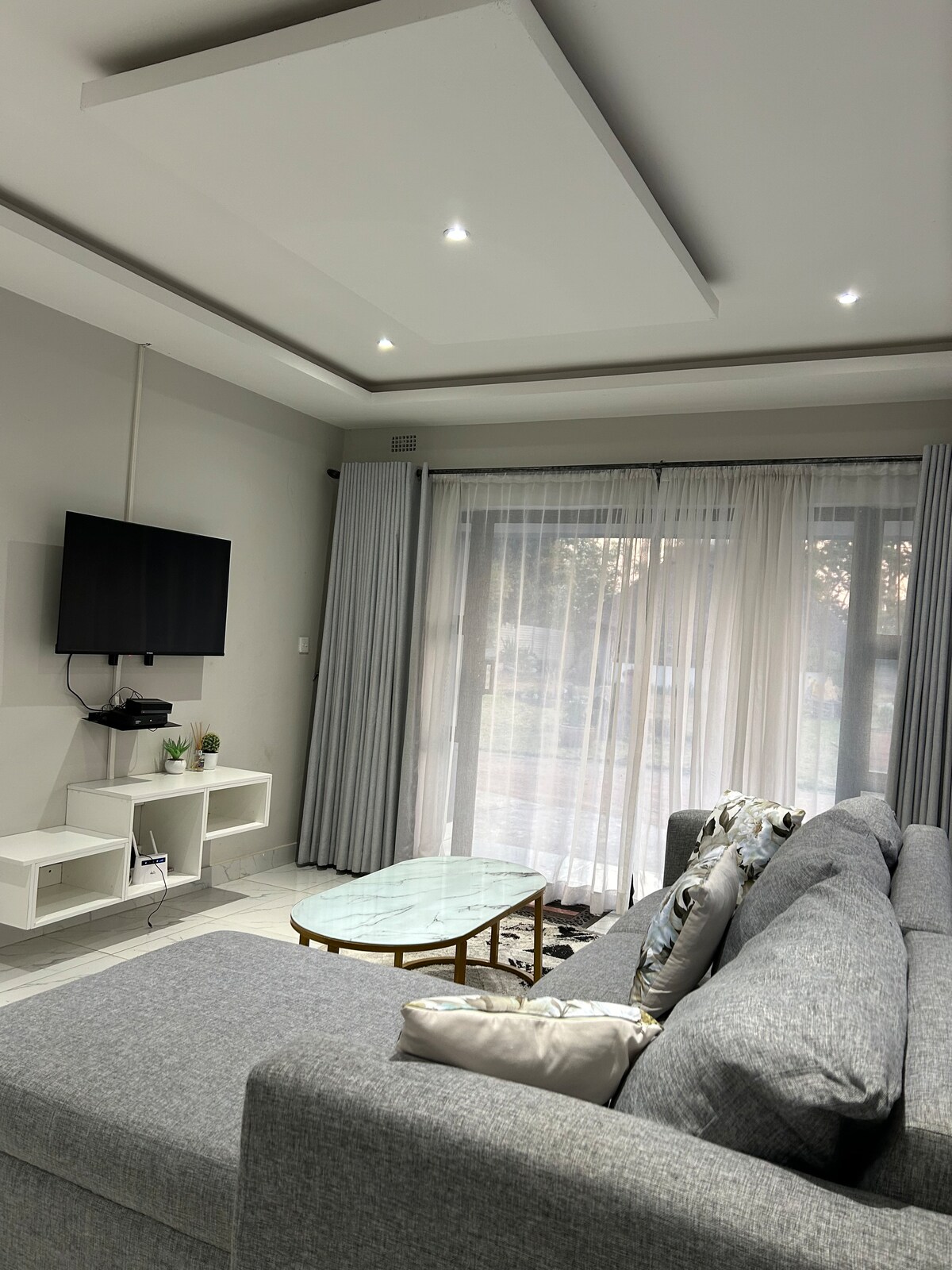 Stylový dům se 4 ložnicemi ideální pro relaxační dovolenou, služební cestu nebo obřad Roora. Nachází se v zelené čtvrti Prospect, Waterfalls. Jen 10 minut jízdy od mezinárodního letiště Harare a 15 minut jízdy od centra Harare. Navrženo pro pohodlí a spolehlivost, s luxusním bazénem, altánem a grilovací zónou. Voda z vrtu a velký solární panel zajišťují hladký a nepřerušovaný pobyt. Hosté mají neomezenou Wi-Fi a klid na duši díky plně elektricky oplocené nemovitosti.