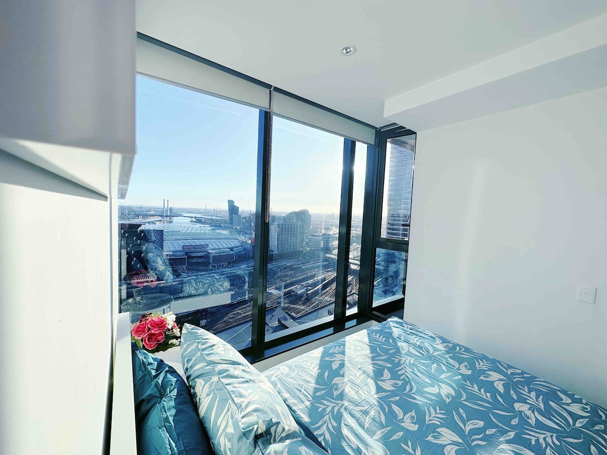 Užij si čistotu a pohodovou atmosféru v tomto ubytování v centru města. Vyzkoušej nejvyšší patro! V Melbourne CBD toto místo opravdu vyniká. Fenomenální západy slunce! Nezastřené výhledy na zátoku, řeky, Docklands, WestGate a Bolte Bridges, vzdálené kopce, městská světla. Pohodlné. Pěšky dojdi do Crown, ConventionC, na stadion Marvel, na stanici Southern Cross, na Mercato Centrale. Skvělé vybavení: bazén/lázně/sauna/posilovna. 1x kvalitní manželská postel + 2x kvalitní rozkládací pohovky, ložní prádlo, horká sprcha, kuchyň, ergonomický stůl, AppleTV