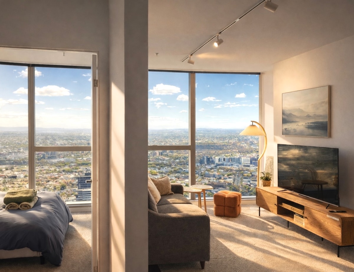 Klidné místo, které můžete nazvat domovem, když jste v Melbourne, váš vlastní apartmán se 2 ložnicemi a 2 koupelnami (64 m² interiéru + 6 m² balkon). Navrženo s ohledem na jednoduchost, moderní a minimalistický styl. Vychutnejte si úžasný výhled na panorama města. Toto je prostor vhodný pro rodiny. Nachází se vedle stanice Southern Cross a autobusového terminálu. Nachází se v bezplatné tramvajové zóně – vše, co Melbourne nabízí, máte na dosah ruky – v blízkosti levných jídel, elegantních restaurací a moderních kaváren.