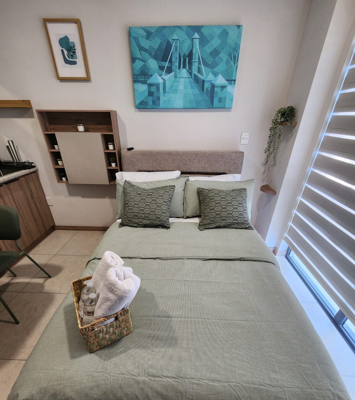 Departamento tipo Loft pequeño con todo lo necesario para una estancia placentera -Cocina Privada con Parrilla, Refri, Micro, Utensilios; ahorra y haz tu super -Baño Privado pequeño y espacioso -Escritorio Amplio y Wifi Veloz, trabaja desde aquí -Cama Matrimonial, descansa y ve la Smart Tv en un colchón confortable -Espacio Suficiente, guarda ropa doblada o colgada -Ventanas Amplias, gran iluminación y ventilación Gran Ubicación para Turismo, Viaje de Trabajo, Estudiantes o Salida en pareja