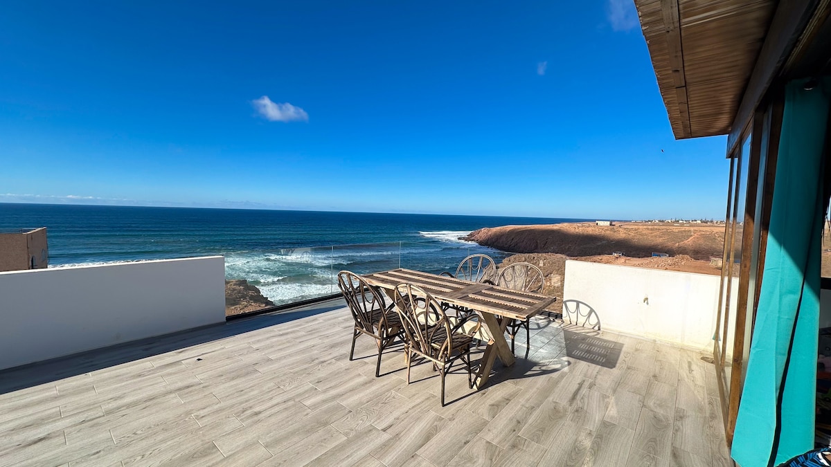 Nestled in vibrant Colorful Aghroud village, Rosyplage is a beachfront gem offering stunning ocean views from every room. Ground :fully-equipped studio 1st floor feels like being on a boat with a Moroccan lounge & 75-inch Netflix-ready TV.Two sea-facing bedrooms await upstairs.Top-level: kitchen leading to a terrace, followed by a sun-soaked solarium ideal for yoga & sunsets.Note: The accommodation is equipped with a surveillance camera at the entrance.the house has 4 levels stairs not suitable
