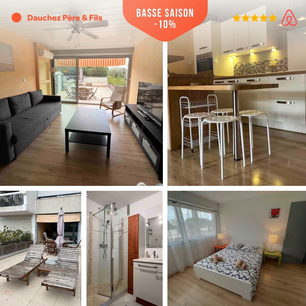 V zalesněné a uzavřené oblasti, klidný, nový apartmán pro 2 osoby o rozloze 30 m2 s vegetační terasou a vybavený soukromý přízemní byt. Soukromý bazén společný pro naše 2 apartmány je vám k dispozici od poloviny května do poloviny září. Pro jakýkoliv výlet je nezbytné mít auto. 2 minuty jízdy od výstaviště, 1 minuta od letiště a 5 minut od pláží. Zabezpečené parkování Ložní prádlo a ručníky jsou k dispozici Důkladné čištění s dezinfekčními postupy