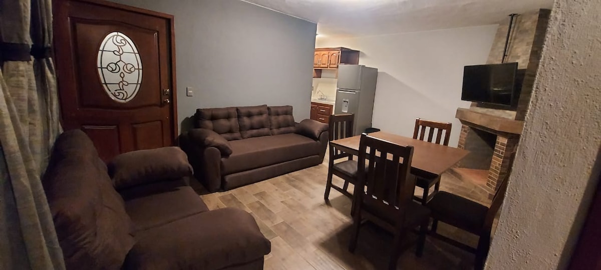 Romantický srub v Mazamitla – ideální pro 2 až 4 osoby nebo malou rodinu Tato krásná chata✨ je ideální pro páry a nabízí vše, co potřebujete, abyste se odpojili a užili si pobyt naplno: Velká 🛏️ manželská postel 🛁 Soukromá vířivka. 🔥 Elektrický krb Velkolepé 🌄 výhledy na les 🍳 - Zásobená kuchyně 🌿 Terasa, kde si můžeš užít přírodu