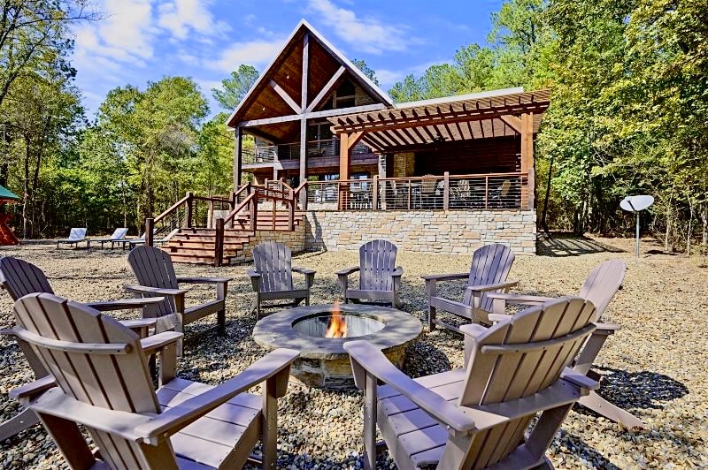 Experience Hidden Oaks Hideaway, a private 1.5-acre retreat minutes from Hochatown and Broken Bow Lake, perfect for families, retreats, and friend groups. Relax by the firelit patio, soak in the hot tub, or unwind in the sauna. Evenings come alive with glow pickleball, outdoor movie nights, and stargazing. With a game room, playground, spacious indoor-outdoor living, and sleeping for up to 15 guests, it’s the perfect setting for unforgettable group getaways.