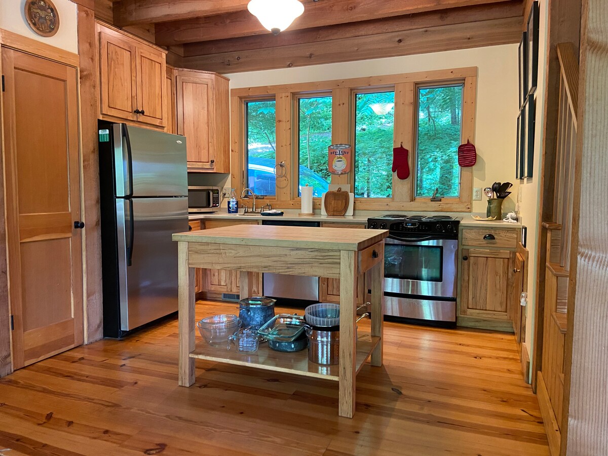 Chata Out of the Blue Cabin má 2 ložnice, 1,5 koupelny a nachází se v malebném West Jeffersonu v Severní Karolíně. S nádherným výhledem je Out of the Blue Cabin dokonalým malým únikovým místem k relaxaci a odpočinku od životních požadavků. Pohodlně se zde vyspí 5–6 osob (5 v postelích a jeden na gauči v obývacím pokoji), má plně funkční kuchyň, plynový gril, WiFi, TV, vše s rustikálním horským nádechem. Povlečení, ručníky, pračka a sušička jsou zahrnuty v ceně.