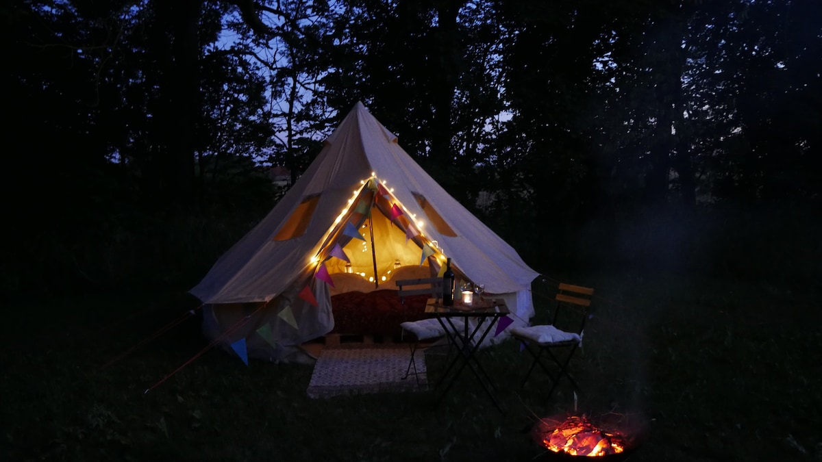Útulný glampingový stan v zahradě statku