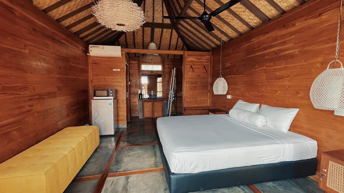 Objev mnoho překvapivých způsobů, jak si odpočinout v tomto samostatném bungalovu v rámci našeho rozsáhlého panství. Procházej se bujnými zahradami, houpaj se na tandemové houpačce ve vintage stylu nebo relaxuj u bazénu z přírodního kamene. Ponoř se do designové vany nebo si vyber knihu, která tě zaujme, a relaxuj na lehátku na terase/verandě. Vaše královská postel je jako spaní na oblaku. Také zahrnuje: – Samostatná kuchyně - Denní úklidová služba – Wi-Fi až 150 Mbps – 8–10 minut pěšky na pláž – Klid a ticho