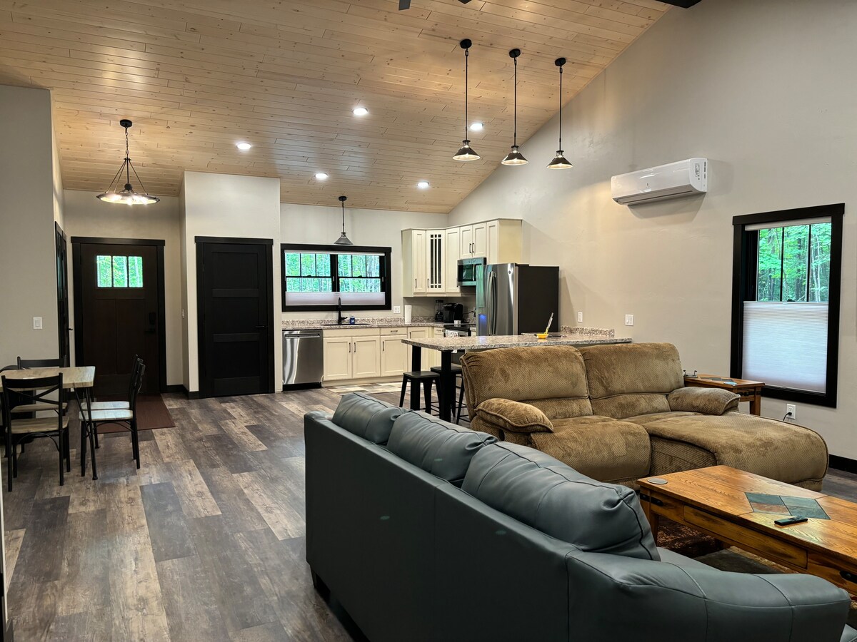 2 ložnice, rodinná chata na slepé ulici s krytou verandou u kuchyně - skvělé místo pro ranní kávu. Dětská postýlka Pack n Play s funkcí kolébky, zásuvkové zástrčky, zámky zásuvek atd. Plně vybavená sada. Ručníky, ložní prádlo, toaletní potřeby, marshmallow tyčinky, pudgy pie, hry, více než 60 filmů, židle na táborák, sprej proti hmyzu, opalovací krém. Chatu si užíváme jako útočiště před naším normálním rušným životem a technologiemi, abychom se odpojili a znovu se spojili s blízkými. Státní lesní stezka ze zadního dvora. Je zde klimatizace.