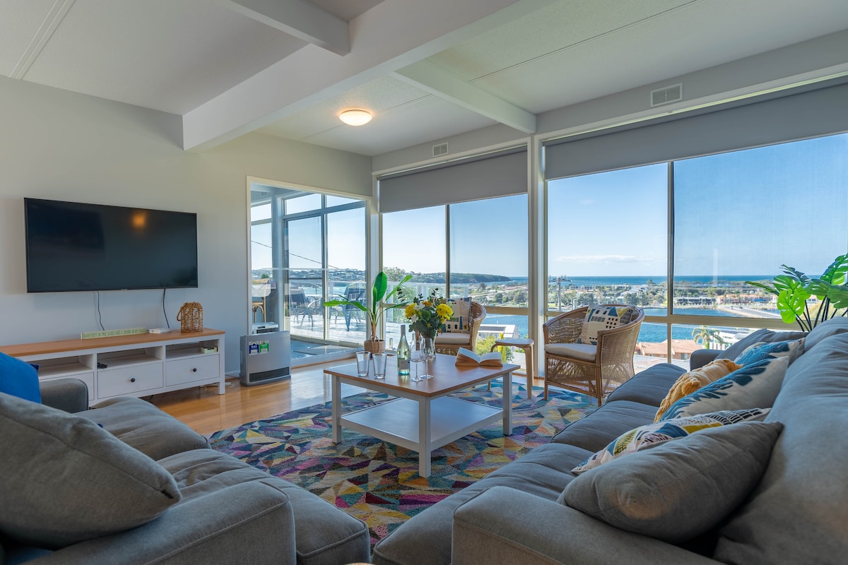 You will love the Crows Nest as soon as you arrive! Located high up on the hill overlooking Merimbula Bay, lake and town. The view is stunning! You will have exclusive use of the lower level of my house with separate entrance. It offers a large openplan lounge, kitchenette, separate bedroom with kingsize bed and a bathroom. The apartment is fully air-conditioned. Watch the magic sunsets from the expansive undercover deck whilst sipping your favourite drink.